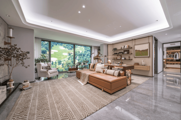 招商臻境143m²的横厅,做了一个很有意思的设计。约6.5米面宽的横厅,支持两种生活形态的自由切换。
