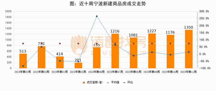 进入2023年第11周(03月06日-03月12日),宁波新建商品房成交1350套,较上周增加174套,环比上涨14.8%