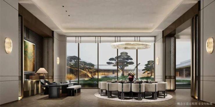 4大东方形制——飞檐画栋:合院的中式屋檐;如置画中:借景框景的建筑结构;奢而不显:合院古铜色金属色调;和谐礼序:传统对称建筑结构。