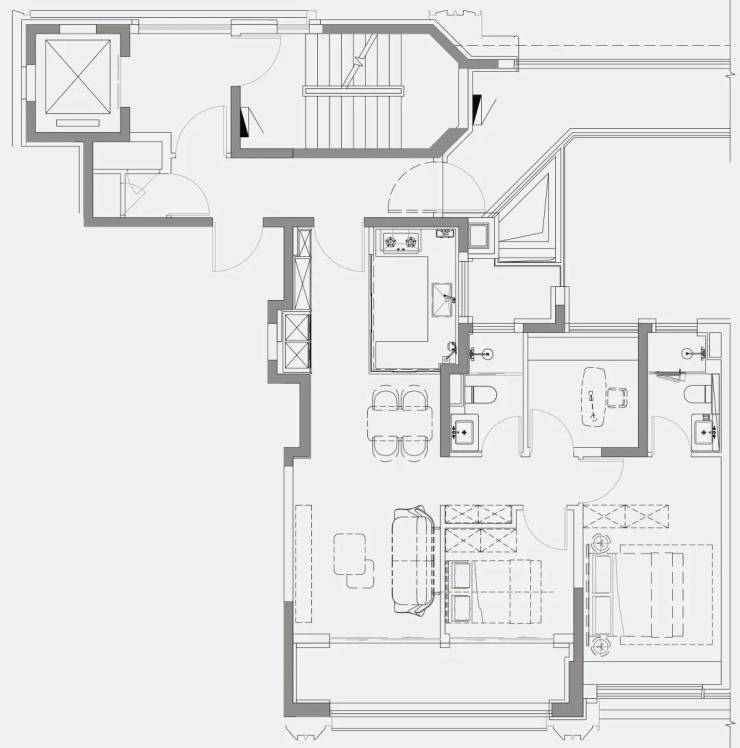 客餐厅通铺简一大板砖(900*1800),地面一体无缝,高级感不言而喻。空调地暖采用东芝同档品牌二联供设计,新风是霍尼韦尔,三大件齐备。