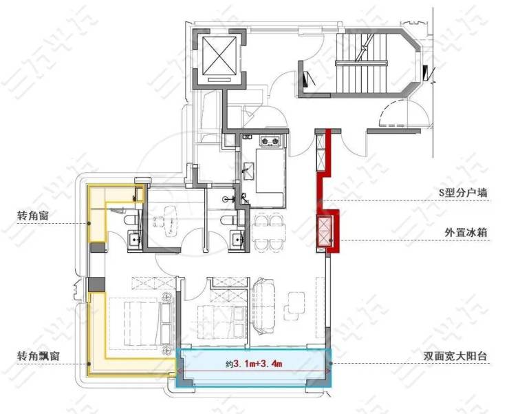 做了南向双面宽的大阳台,赠送更多,实用性更强;分户墙也升级成S墙,增加空间使用效率,同时,冰箱外置还释放了厨房的空间;边套还设置了南北两个转角飘窗。