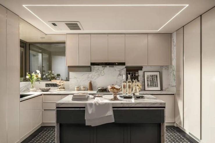 整体动静分区格局。在U型厨房基础上融入 “社交属性”,让烹饪时亦可与客厅家人互动。