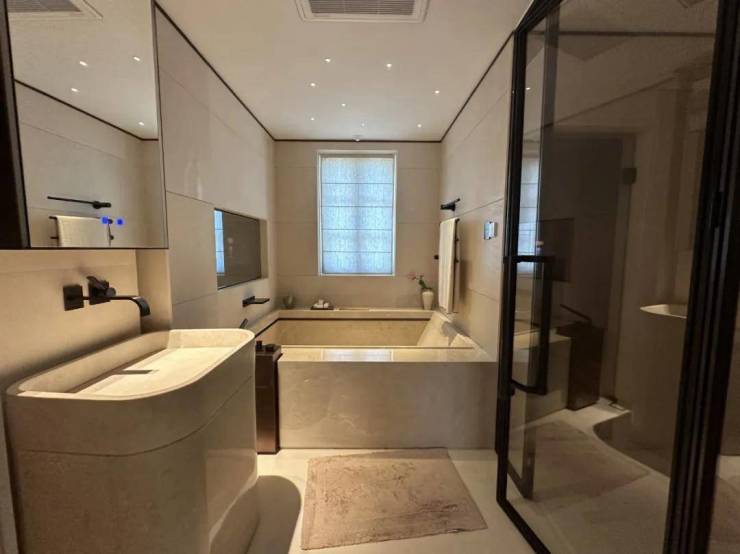 而样板间里这第二个卫浴空间,更接近于享受级。嵌入式浴缸,设计了魔镜系统,可以供业主泡澡时观影娱乐;除此之外,这个卫生间也有独立的淋浴房,并设计有桑拿房。