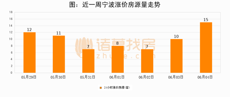 根据诸葛找房数据显示,宁波24小时涨价房源量为15套,较06月03日增加5套,环比上涨50%。与此同时,涨价房源占比小幅扩大,业主信心有所提升。
