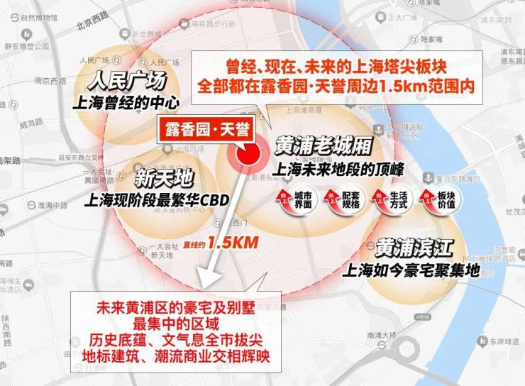 作为上海绝对市心,露香园直线距离人民广场、淮海路、新天地、外滩、豫园等上海市地标性区域均不超过1.5公里,距离陆家嘴直线约2公里。