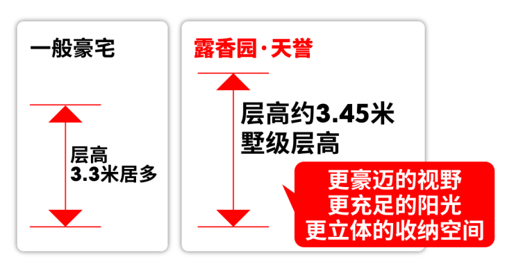 市面豪宅层高普遍3.3米,而露香园·天誉层高达约3.45米,堪比别墅。