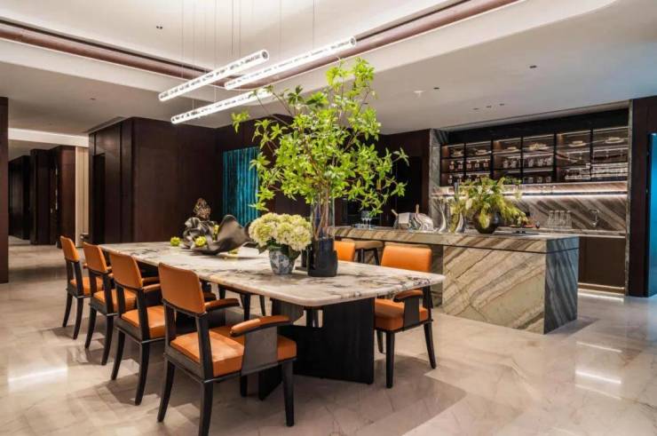 西厨吧台更是匹配了符合空间调性的东方木纹与龙飞凤舞石材,独特的纹理和质感提升了厨房品质与艺术性。