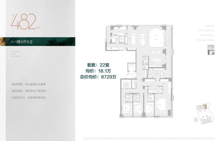 482㎡,3号楼东边套,均价18.1万,基本属于5房5卫,从这里开始,4个卧室全部套房设计,自带卫生间。