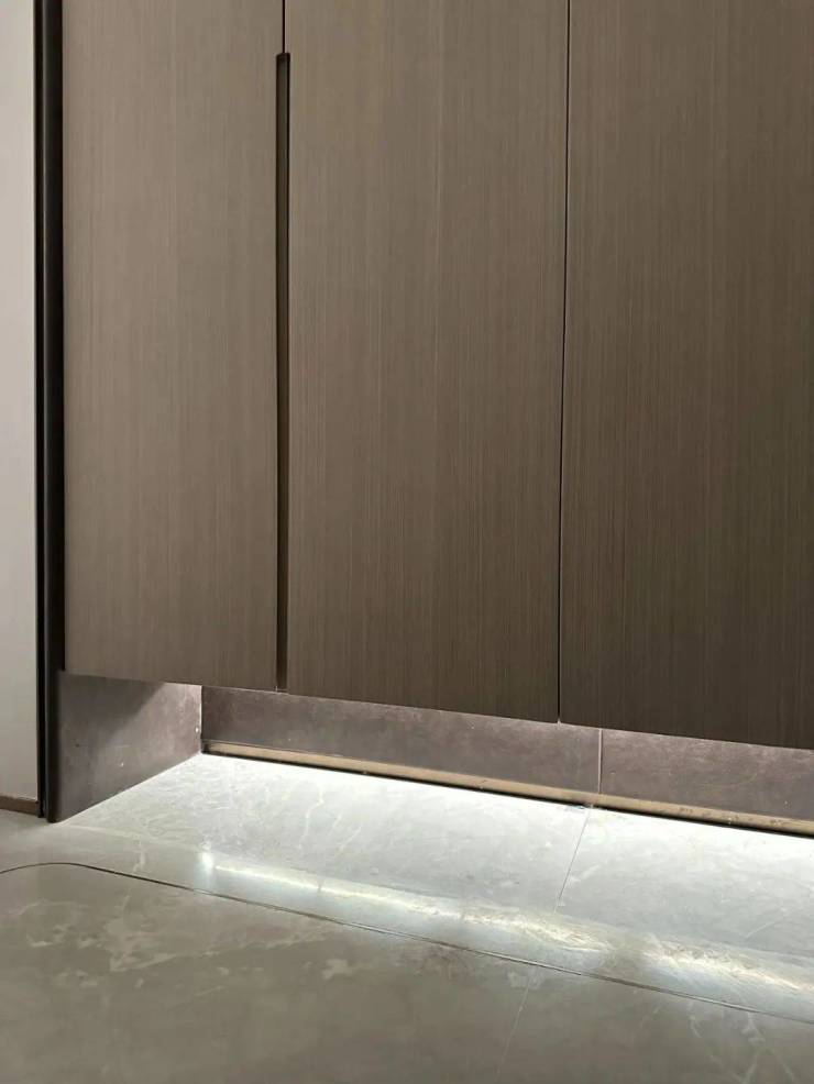 鞋柜下方做了悬浮处理,同样也是内嵌灯带,这里灯光的角度还会再调整,因为灯光映射在大理石地面上,要显得尽量柔和不刺眼;同时,鞋柜下方可放拖鞋,还能放扫地机器人,便于日常清扫打理。