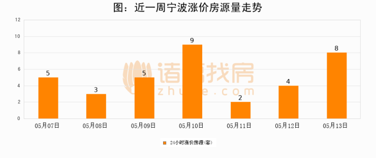 根据诸葛找房数据显示,宁波24小时涨价房源量为8套,较05月12日增加4套,环比上涨100%。与此同时,涨价房源占比小幅扩大,业主信心有所提升。
