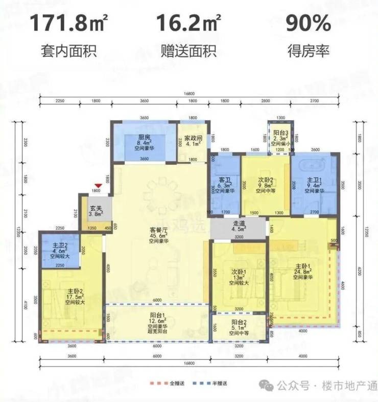 170㎡,4开间超南面宽达15.7米;餐客厅面积达到44个平方米;厨房开间达到4.35米。