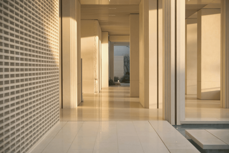 架空层观景平台上,柱廊、水庭与树影交融成诗,喧嚣在光影流转间被时光温柔稀释。归途于此,以水之哲学,成就无界的心灵栖居。