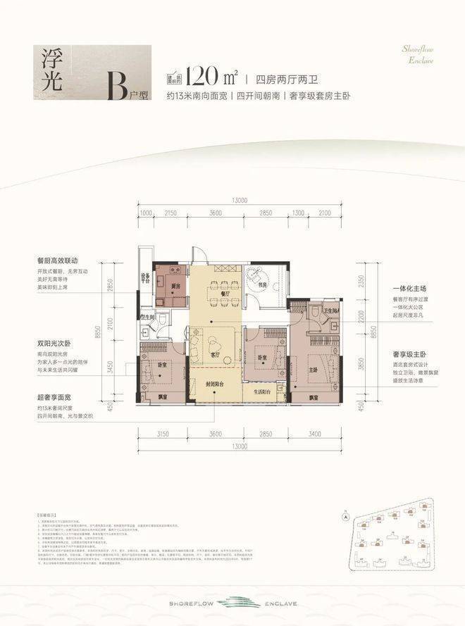 这款户型堪称四开间朝南的“流量王者”,南向面宽约13米,双联阳台+双飘窗设计,视野和采光优秀;套房主卧、双阳光次卧,颇有大平层的气势。