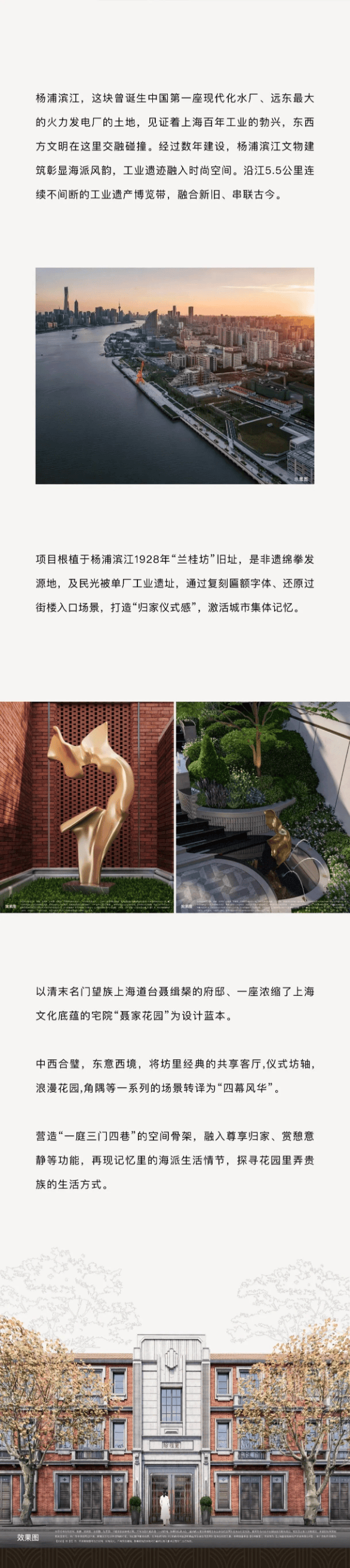 项目定位:内环内罕见的低密度海派风貌社区,容积率仅1.35,绿化率高达58%,主打“红砖建筑+一庭三门四巷”传统格局