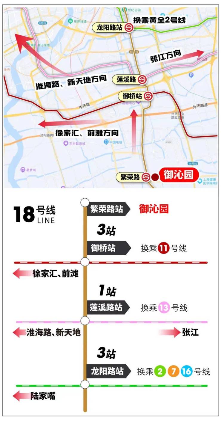 地铁18号线繁荣路站:步行约100米(1号口直达),3站达御桥换乘11号线,7站至龙阳路换乘2号线