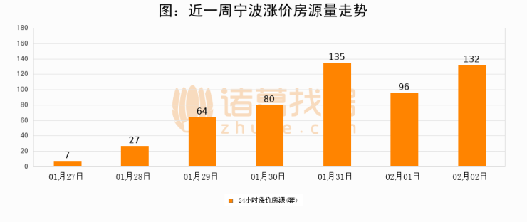 根据诸葛找房数据显示,宁波24小时涨价房源量为132套,较02月01日增加36套,环比上涨37.5%。与此同时,涨价房源占比小幅扩大,业主信心有所提升。