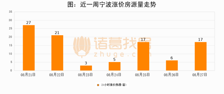 根据诸葛找房数据显示,宁波24小时涨价房源量为17套,较08月26日增加11套,环比上涨183.3%。与此同时,涨价房源占比小幅扩大,业主信心有所提升。