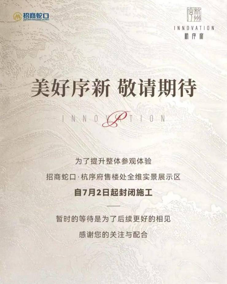 根据可靠消息爆料:杭序府,自7月2日起,示范区封闭施工。