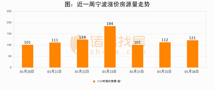 根据诸葛找房数据显示,宁波24小时涨价房源量为121套,较04月25日增加9套,环比上涨8%。与此同时,涨价房源占比小幅扩大,业主信心有所提升。