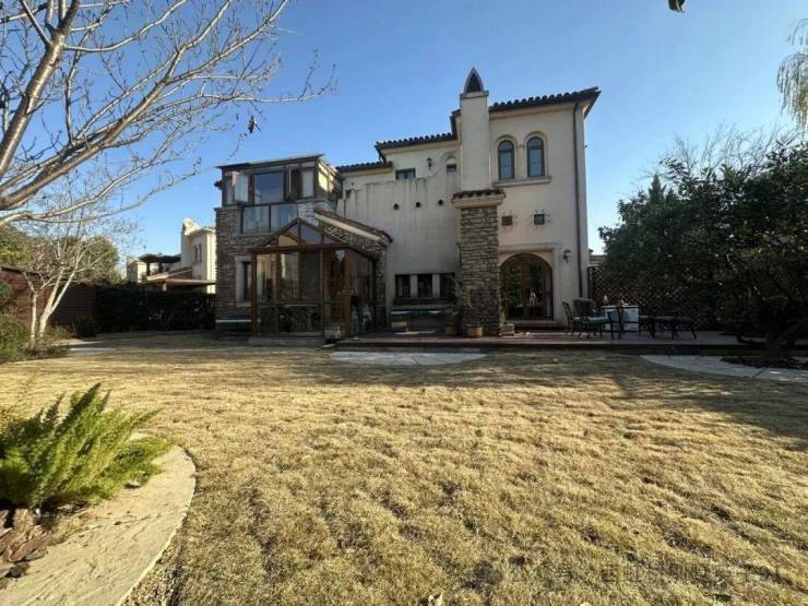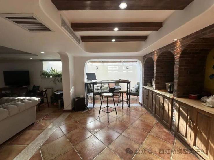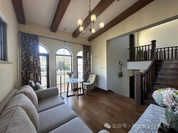 南加州建筑风格:外立面采用淡黄色手工Stucco抹灰外墙和红瓦屋顶,融入原木、三色瓦片、红砖、铁艺等元素,异域风情浓厚