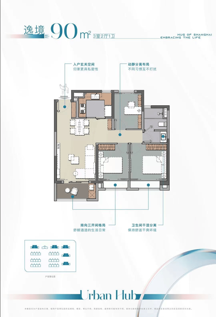 90㎡三房两厅一卫,三开间朝南户型,动静分离。样板间实景图如下: