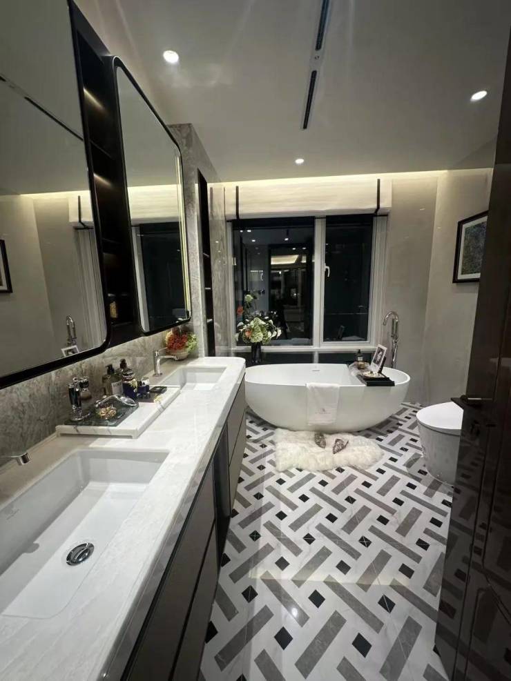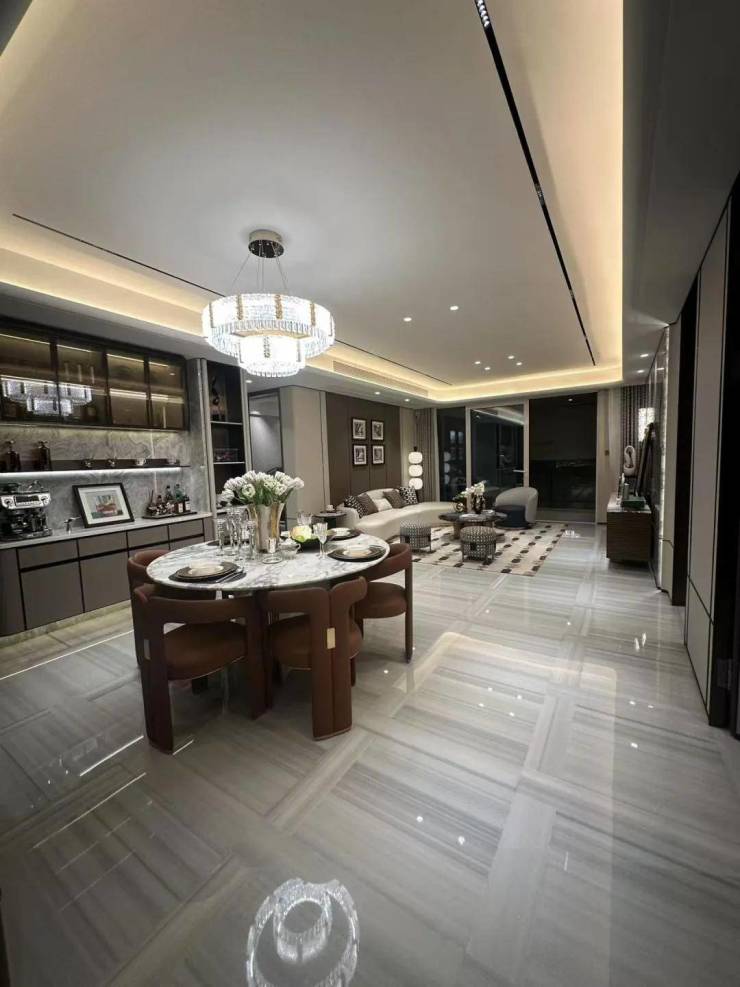 而且在用料上,别的项目还在拼石材的时候,锦上观澜已经跨级展示了,用的都是奢石甚至是进口玉石来铺装。比如地面是卡里冰玉(非洲)铺装,墙面是皇家白玉(丹麦)铺装,整体质感温润高级,非常有气质。