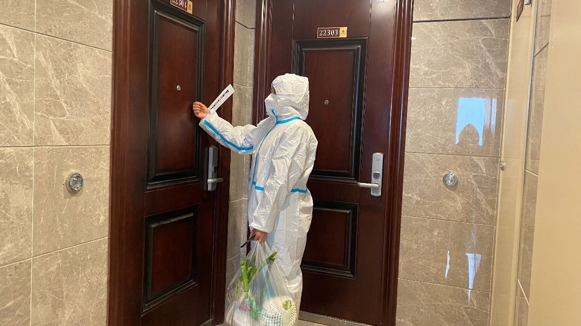 身穿防护服的中南服务西安区域物业人员为业主送物资上门。图片来源 企业供图
