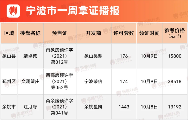 上周宁波大市共3个楼盘取得许可证,入市房源共计 1793套 ,其中市六区共计 174套 。