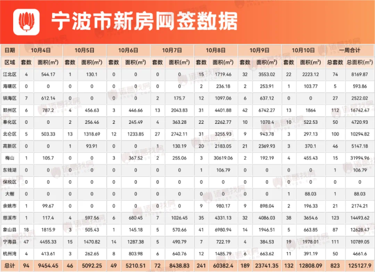 第41周(10.04-10.10),宁波大市共网签商品房 823套 ,共计网签面积 125127.9 平,环比前一周(1237套)下跌 33.47% 。