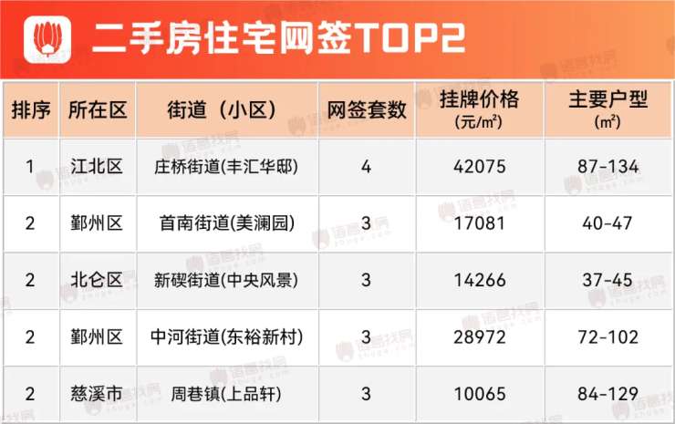 热门成交小区TOP2中, 庄桥街道(丰汇华邸)上周网签 4 套,排名排名前列; 首南街道(美澜园)、新碶街道(中央风景)、中河街道(东裕新村)、周巷镇(上品轩)上周网签各 3 套;