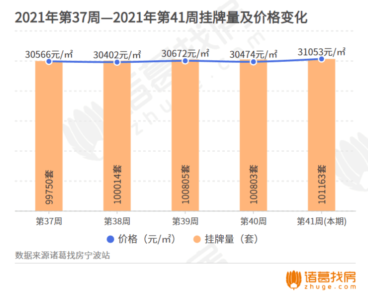 据诸葛找房宁波站数据统计,上周宁波二手房挂牌房源量为101163套,挂牌均价为31053元/平,相比前一周(30474元/平),环比 涨幅1.9%,价格微涨 。