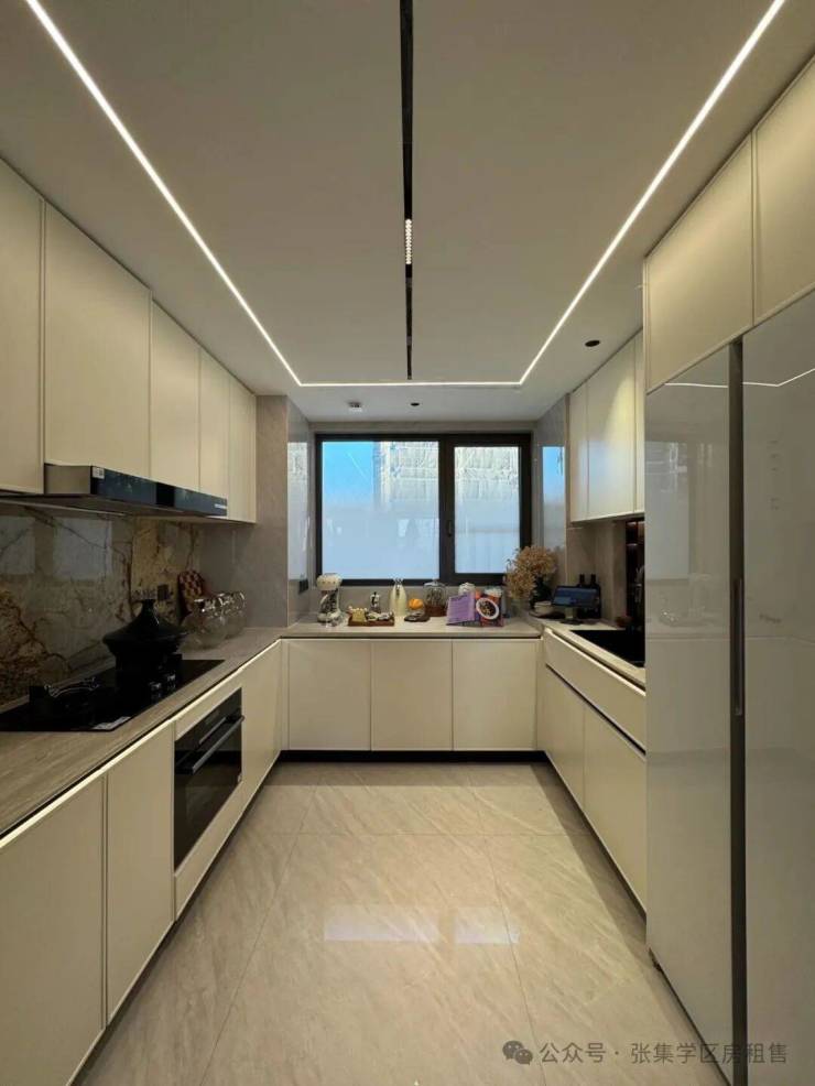 厨房配备博世洗碗机和冰箱2件套,油烟机、燃气灶和蒸烤一体箱老板三件套,帝朗多功能大单槽,悍高天使拉篮、RO反渗透净水器、博洛尼橱柜,隐藏式凉霸