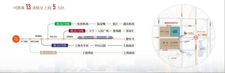 约600米直抵7号线美兰湖站,一线直达静安寺,可换乘13条轨交,高速通达上海5大区约300米即达约70万方中集金地美兰城TOD (数据源自中集金地美兰城官方微信公众号)