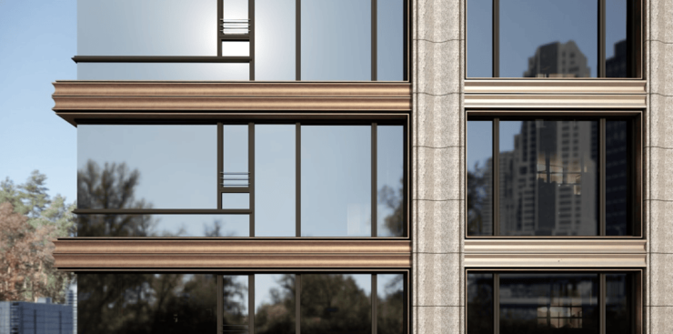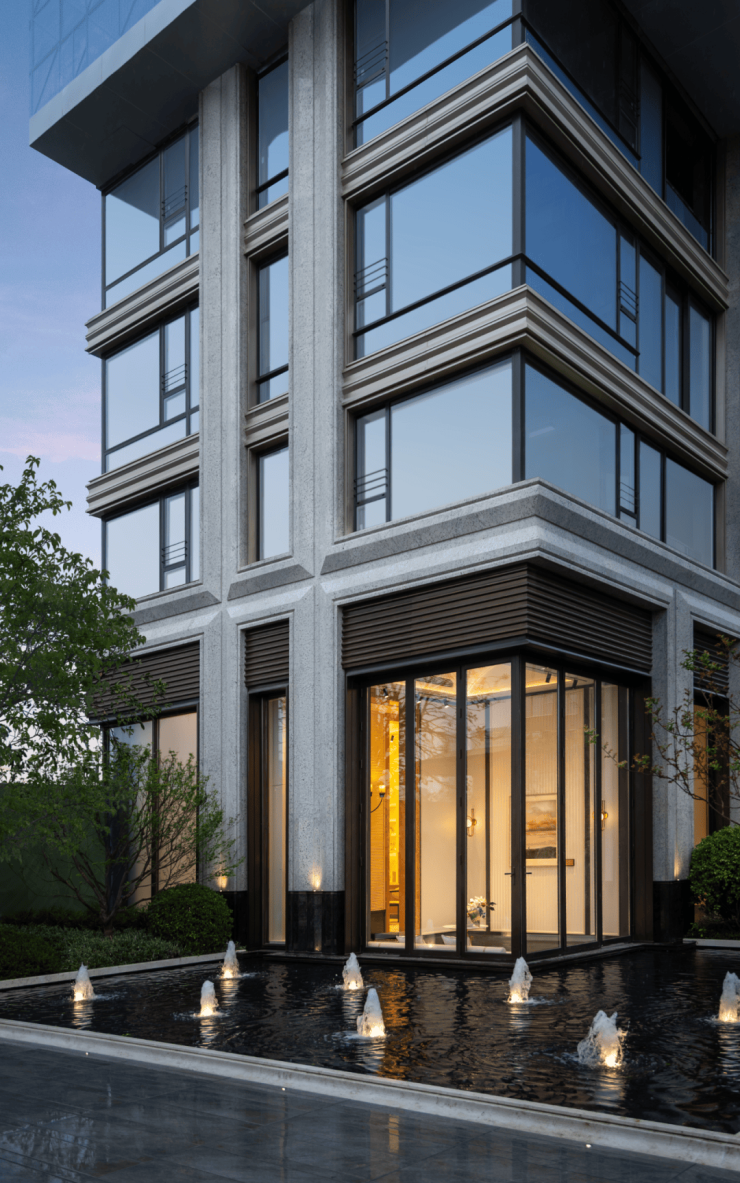 选用石材、铝板等高品质材料,古铜色金属与通透玻璃搭配,结合专属定制单元门及中式挑檐,只为业主归家的一抹温暖质感。