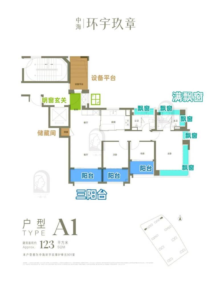 以建面约123㎡3房为例,南向4开间,3阳台+6飘窗+1设备平台。