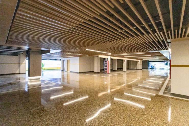 再将目光聚焦到一般项目容易忽视的地库空间。明亮阔绰的地库空间内,顶部以咖色格栅及吊顶光源重塑空间层次感,与之相对应的是在灯光下熠熠生辉的彩石地坪。