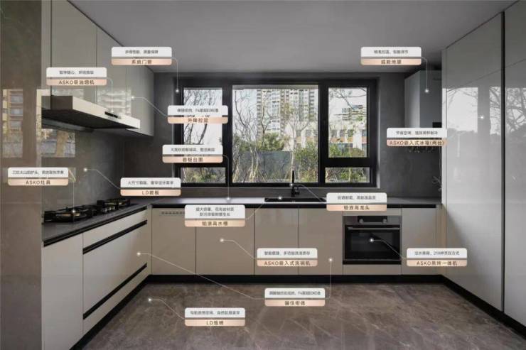 在厨房空间,项目配备了厨电界的“爱马仕”ASKO厨电六件套(油烟机、三眼燃气灶、洗碗机、蒸烤一体机、两台嵌入式冰箱)以及德国高端水槽品牌BLANCO的花岗岩石墨水槽和可抽拉式水龙头等,以卓越品质、技术创新与健康呵护诠释高奢人居新体验。
