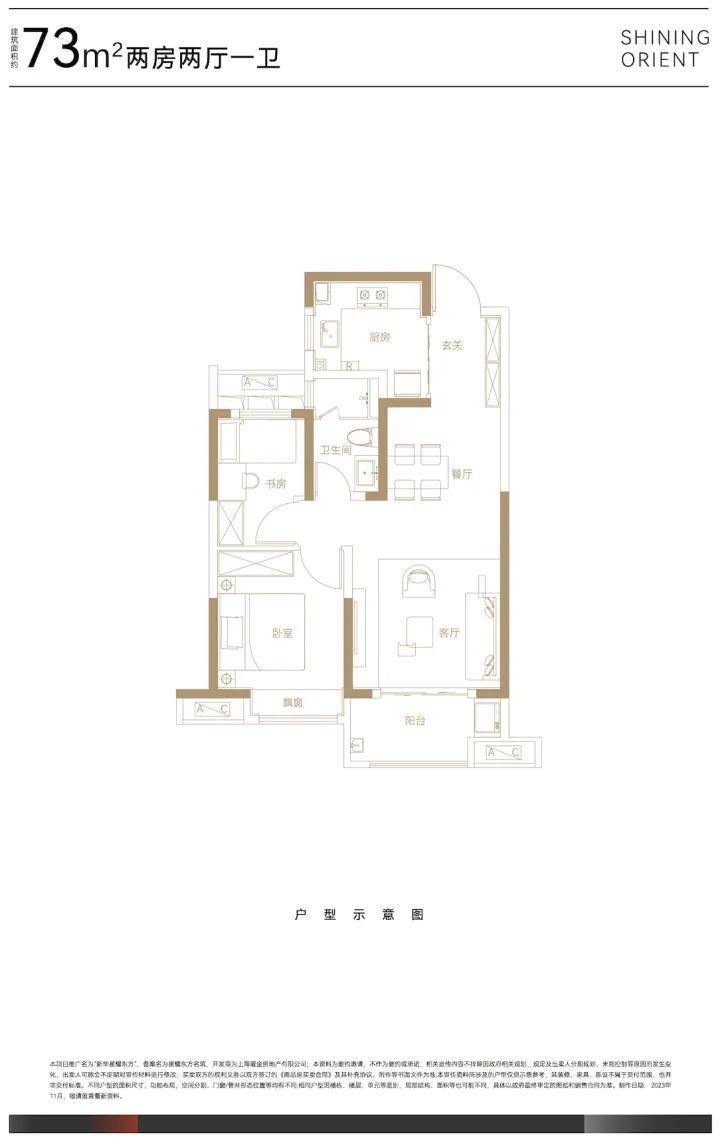 73㎡两房户型,小而精致,南北通透,户型方正,采光通风俱佳,另有多个飘窗赠送,极大的增加使用空间,功能合理居住舒适。