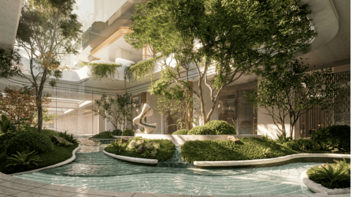 叠加产品规划下沉式庭院,结合绿植与叠水打造立体园林