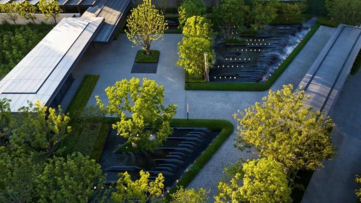 与连廊衔接的地下会所同为SCDA作品,延续了整体布局秩序与平衡,通过中庭花园和超白玻璃的大量使用,将自然光引入地下,使整个会所显得更加开阔和明亮,当然,这席高定艺术会所仅向小区业主开放~