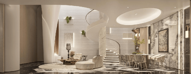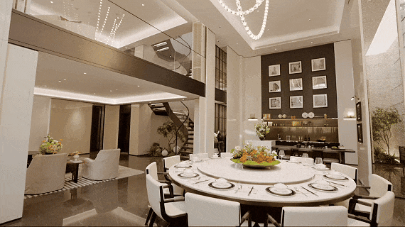 走进约 258㎡联排样板间,便能感受到空间的阔绰与尊崇:一层约3.6m层高,让室内空间尽显通透,告别压抑;客厅大面宽设计,让阳光与园林景观自然入户,将窗外风光化作室内画卷。