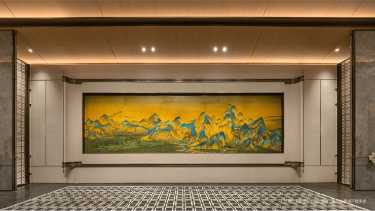 穿越门厅,九米巨幅《千里江山图》非遗漆画豁然呈现,天然大漆历经千道工序,再现青绿山河的壮丽磅礴,昭示着“归家,便是走入一幅传世名画”的崇高礼序。