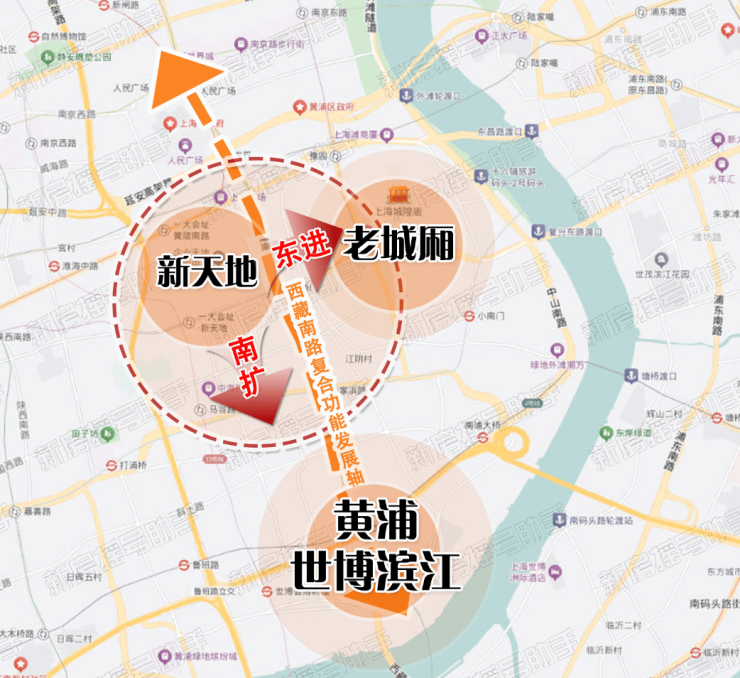 其中,西藏路纵向轴线串联从人广到世博滨江的多个地标,让功能组团在城市空间中流动起来。
