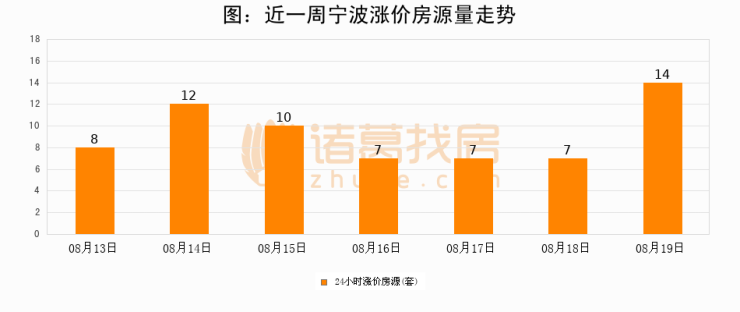 根据诸葛找房数据显示,宁波24小时涨价房源量为14套,较08月18日增加7套,环比上涨100%。与此同时,涨价房源占比小幅扩大,业主信心有所提升。