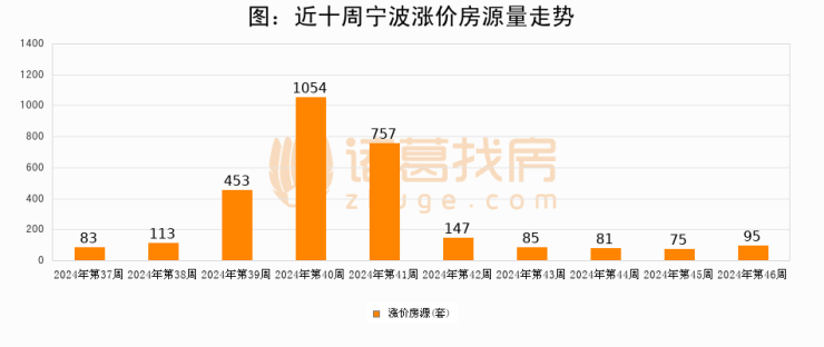 从调价房源来看,第46周宁波涨价房源95套,较上周上涨26.7%。与此同时,46周涨价房源占比提升3.96个百分点,业主信心持续恢复。