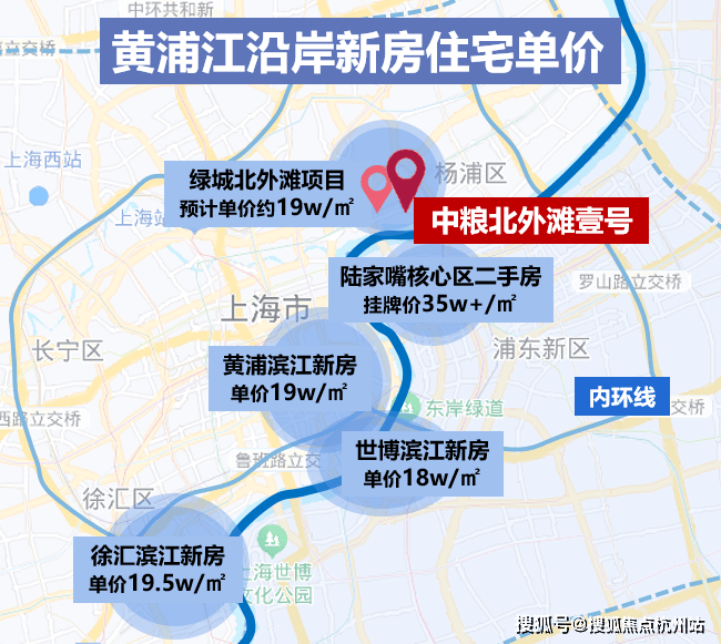 在上海一线滨江板块地图中,陆家嘴,黄浦滨江、徐汇滨江等地新房单价都已突破 19万/㎡ 。今年6批次,北外滩地块也紧随其上,溢价率46.3%,预计售价约 19万/㎡ 左右,成为今年最炙手可热的滨江板块之一。