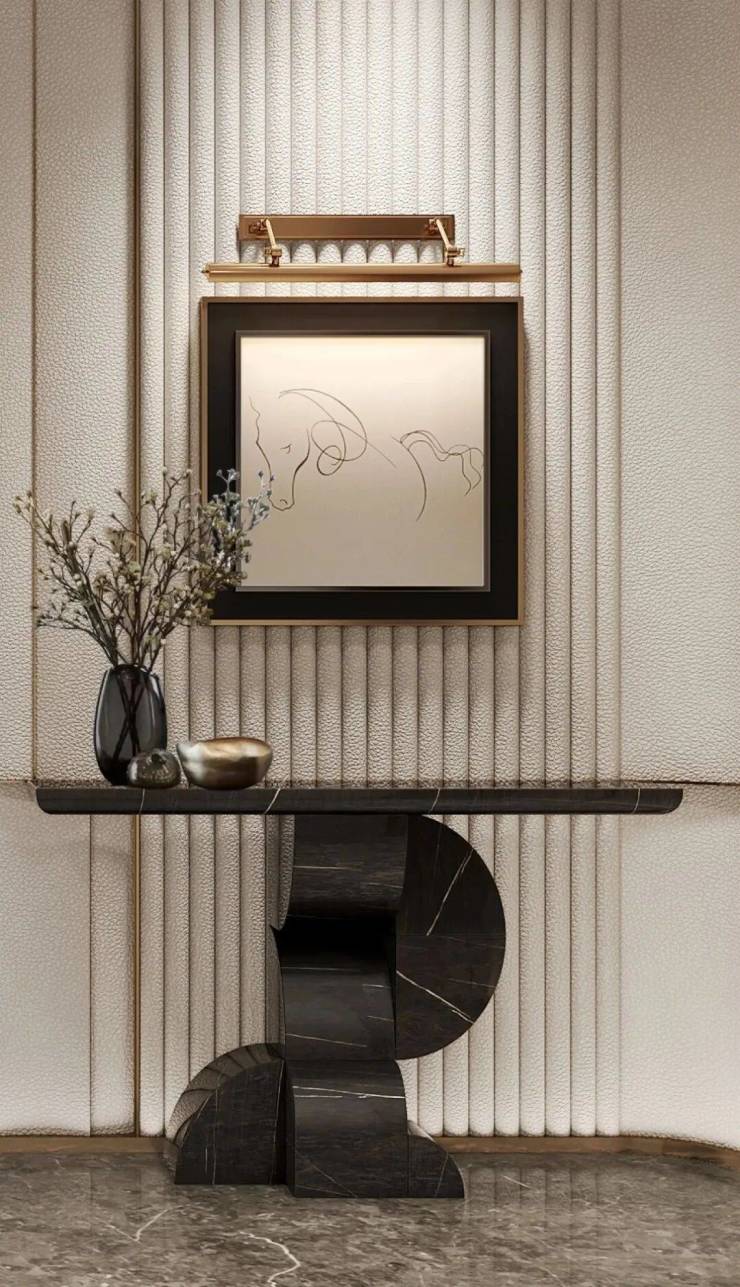 两梯一户的电梯厅,装甲门打开,映入眼帘的是约90㎡的大方厅,约4.2m的层高更是把空间的奢阔放到极大。96%的超高得房率。(建面约)360㎡做了四套房+保姆间,每个房间尺度都很大。鱼肚金的背景墙来自意大利卡拉拉矿,是米开朗基罗雕刻大卫像用的石材,这一刻有了神性的艺术光芒。