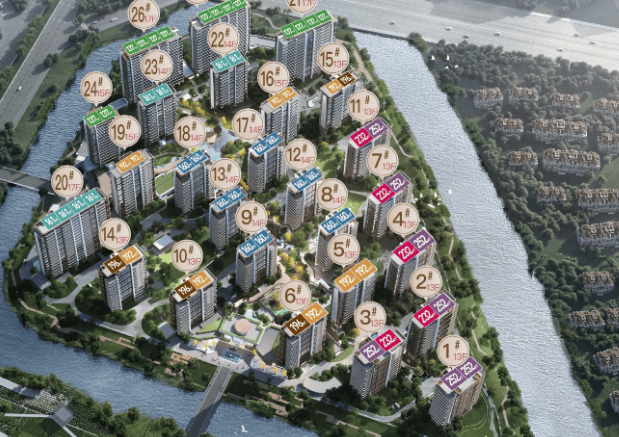 规模参数 :占地约 8.2 万㎡,建面约 21 万㎡; 26 栋 13–17 层小高层 ,共 802 户 ; 容积率 1.8 ,全岛绿化率约 52%,车位比 1:2.2 (改善充足)
