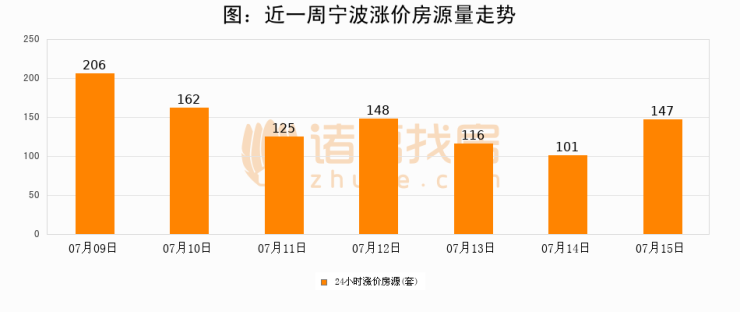 根据诸葛找房数据显示,宁波24小时涨价房源量为147套,较07月14日增加46套,环比上涨45.5%。与此同时,涨价房源占比小幅扩大,业主信心有所提升。