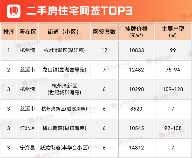 热门成交小区TOP5中, 杭州湾新区(聚江苑) 上周网签 12 套,排名排名前列, 龙山镇(昱湖壹号苑) 网签7套,排名第二。